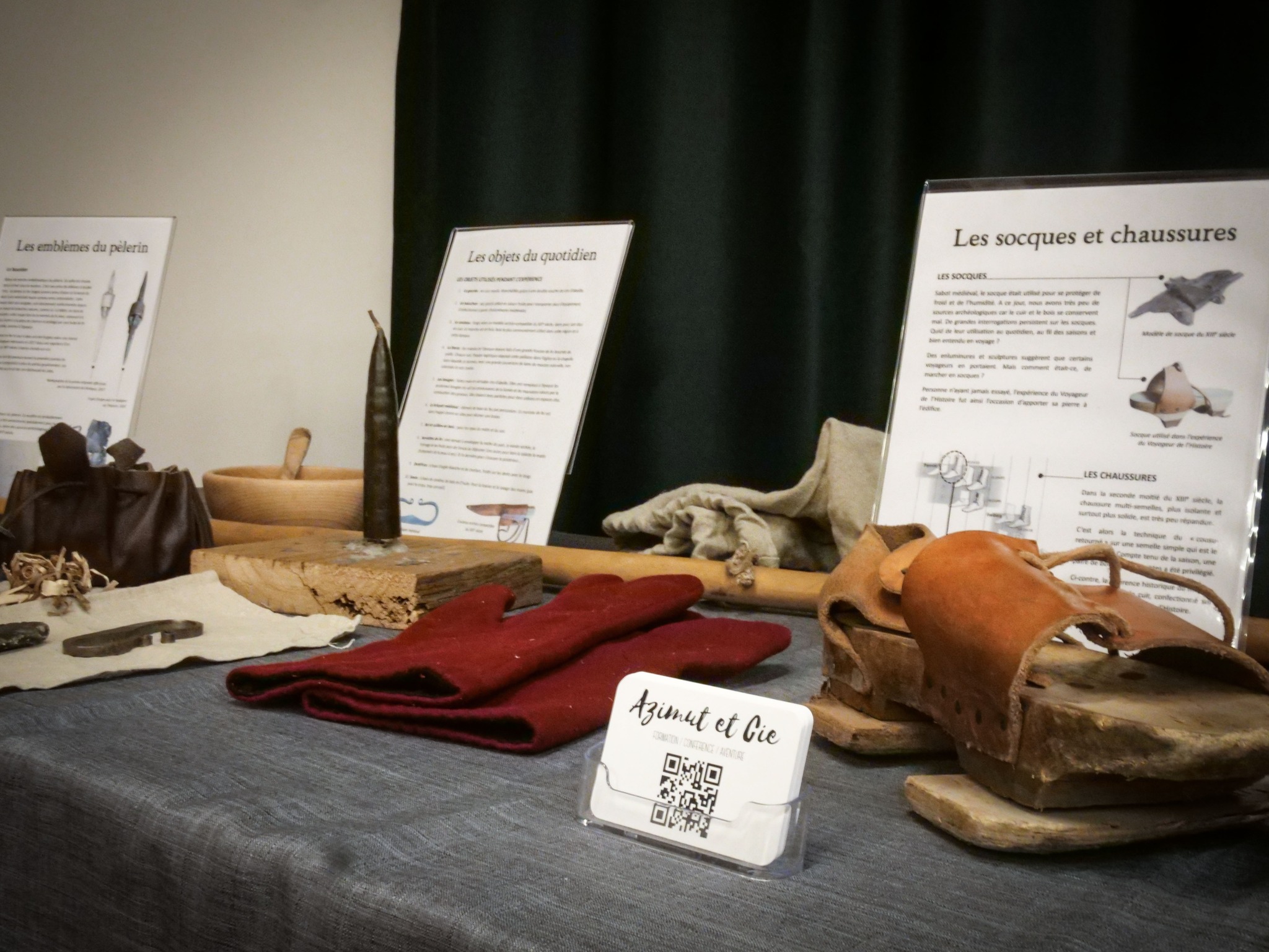 Vêtements et accessoires de voyages fabriqués comme ils l'étaient à l'époque par les artisans médiévaux, cartes, récits des dangers rencontrés sur la route par les pèlerins... L'aventurier-conférencier vous a fait voyager en plein Moyen Âge, sur les chemins historiques qui mènent à Saint-Guilhem-le-Désert !